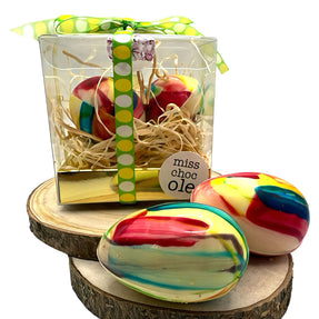 DOS HUEVOS CHOCO M Dos huevos de chocolate, relleno de pequeños dulces y detalles presentado en una caja de regalo, es el detalle perfecto...