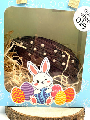 HUEVO CHOCO XXL Un huevo de chocolate grande tamaño XXL, relleno de pequeños dulces y detalles presentado en una caja de regalo, es...