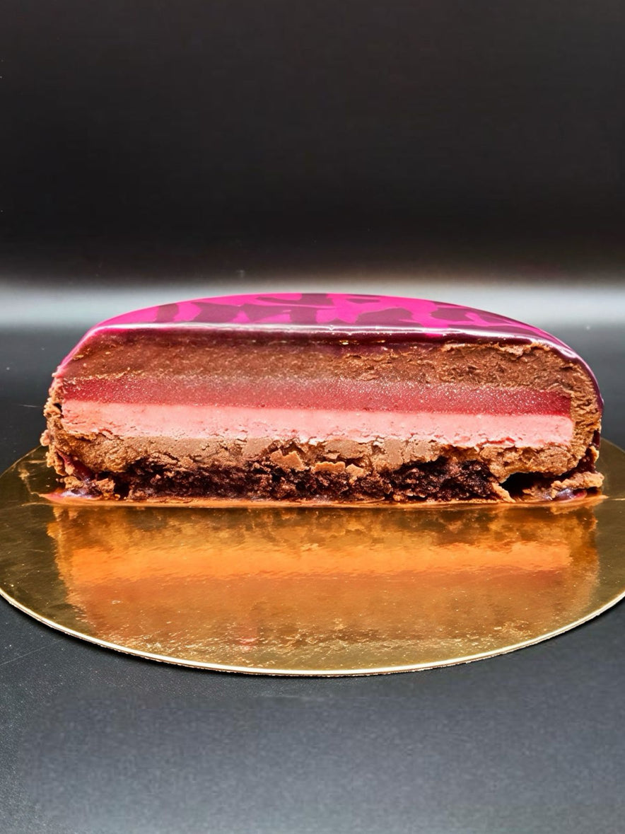 Sabor: Mousse de chocolate con corazón de gelée y namelaka de fresa, sobre bizcocho de chocolate.