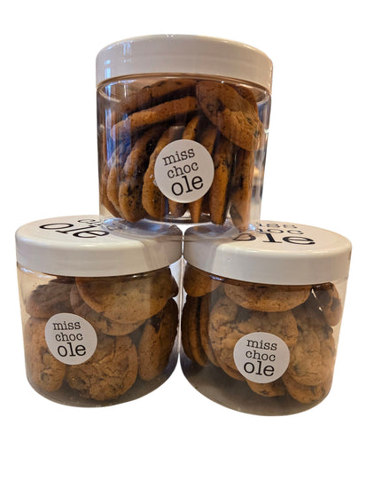 Delicioso bote de crujientes cookies con chips de chocolate.